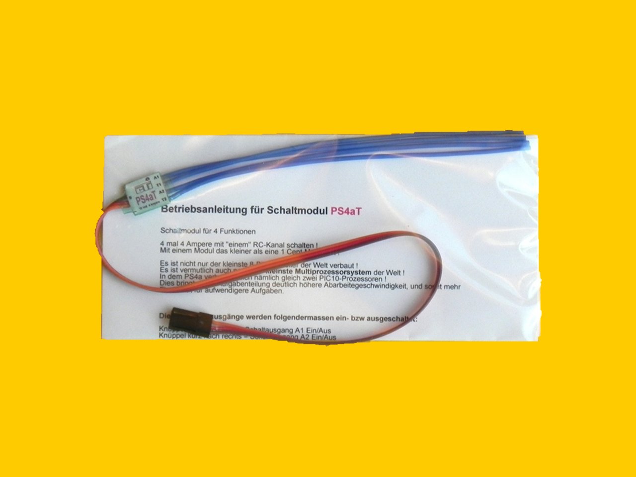 Schaltmodul 4-fach (PS4a) Schaltmodul für 4 Funktionen 4 mal 4 Ampere mit "einem" RC-Kanal! Im Sender sind keinerlei Änderungen nötig! |